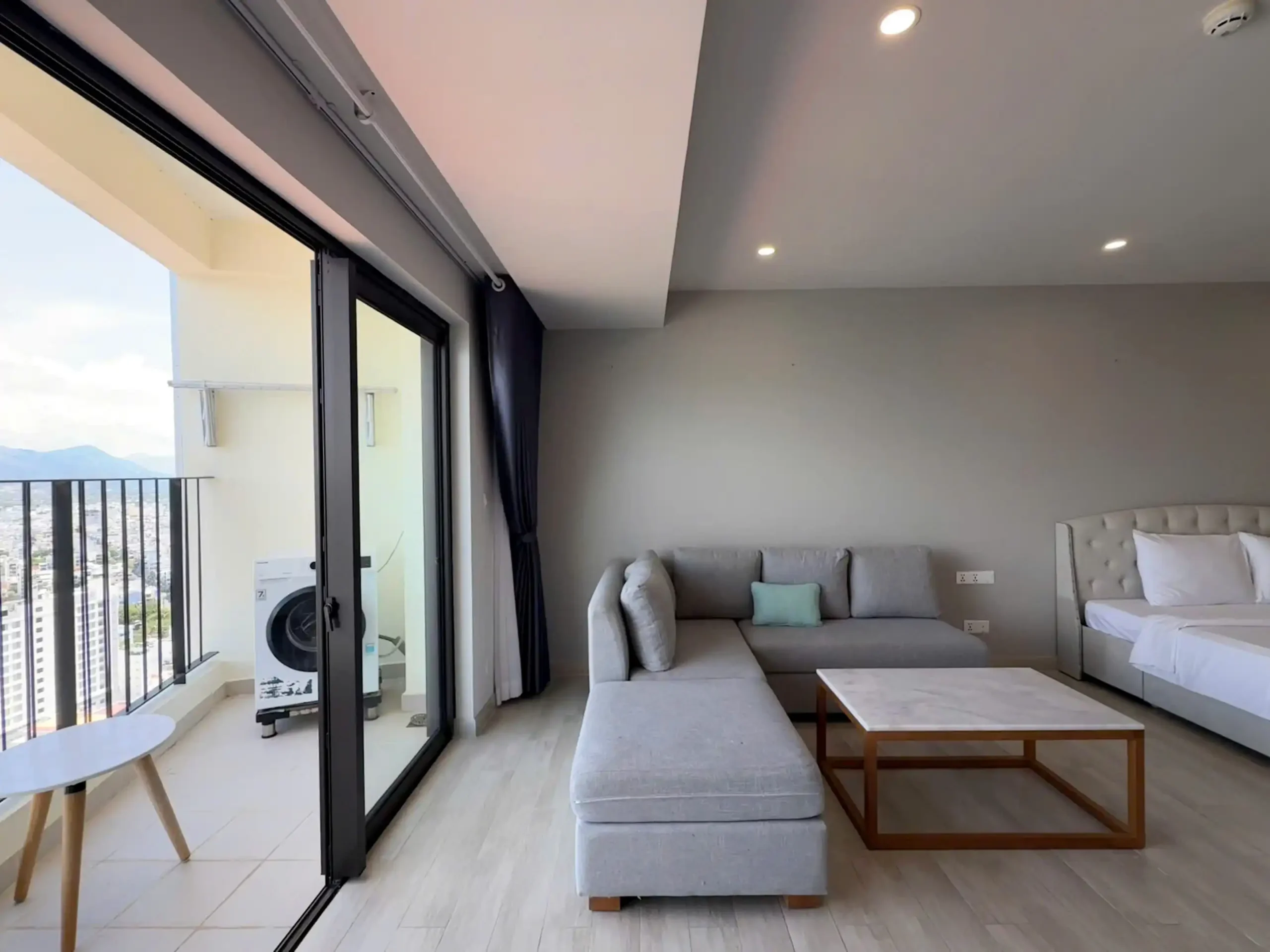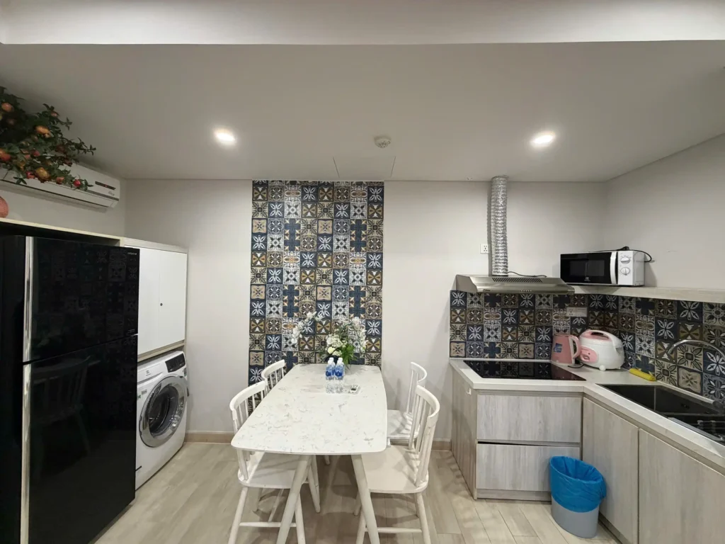 Không gian sinh hoạt được trang bị đầy đủ nội thất tiêu chuẩn và tiện nghi hiện đại như: ban công hướng Đông Bắc đón gió biển, 1 phòng vệ sinh, khu bếp nấu ăn hoàn chỉnh, tivi, tủ lạnh dung tích lớn 200L, lò nướng, máy giặt cùng nhiều thiết bị cần thiết khác – mang đến cảm giác tiện nghi như ở chính ngôi nhà của bạn.