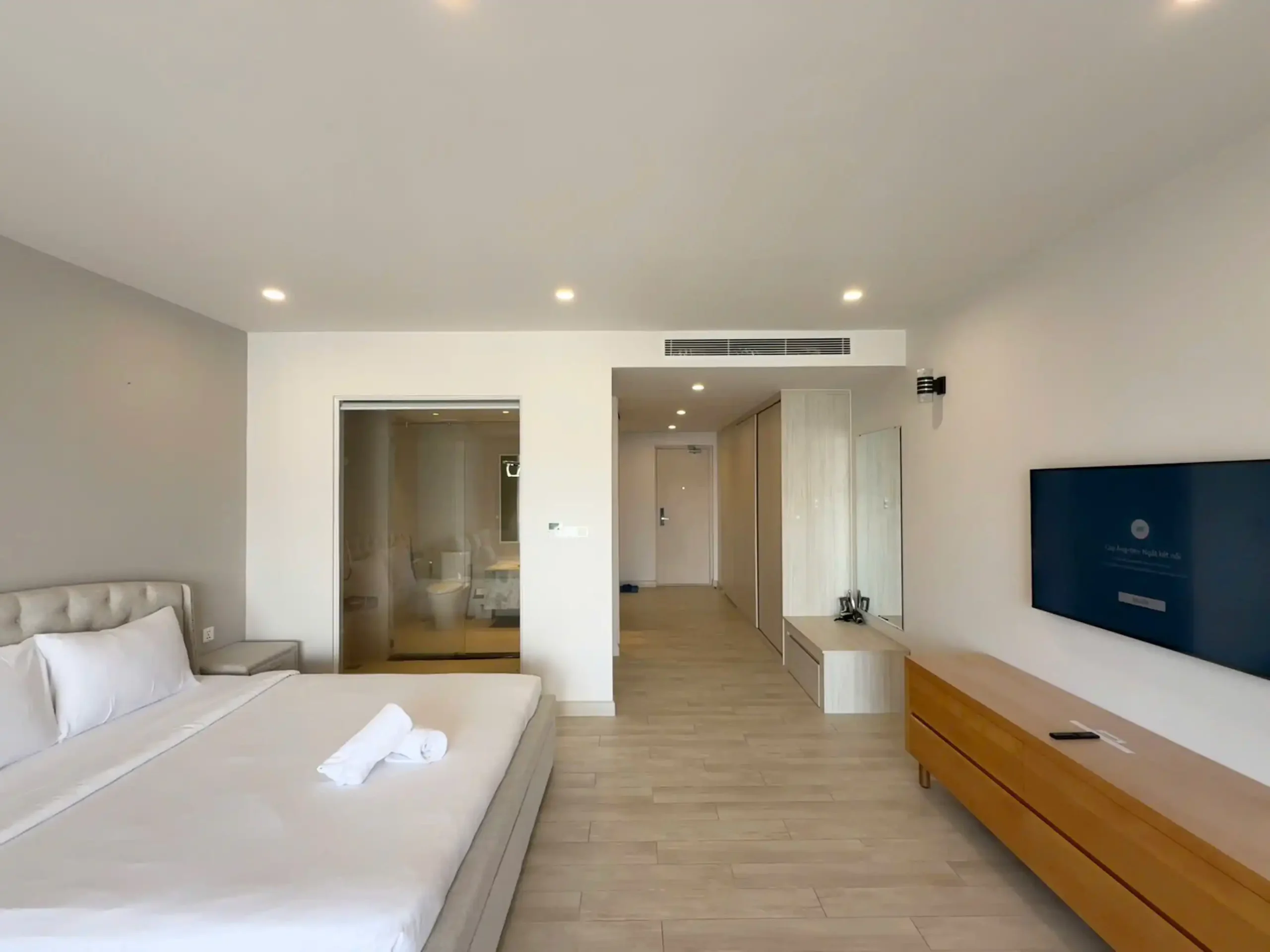 Căn hộ có diện tích rộng 62m², được thiết kế hiện đại và sang trọng, cho không gian thoáng đãng và rộng rãi. Nơi nghỉ ngơi là 2 giường 1m8 ở 2 phòng ngủ riêng biệt, đáp ứng tiêu chuẩn lưu trú 4 người lớn và 2 trẻ em dưới 12 tuổi. Ngoài ra còn có thêm ghế salon lớn êm ái.