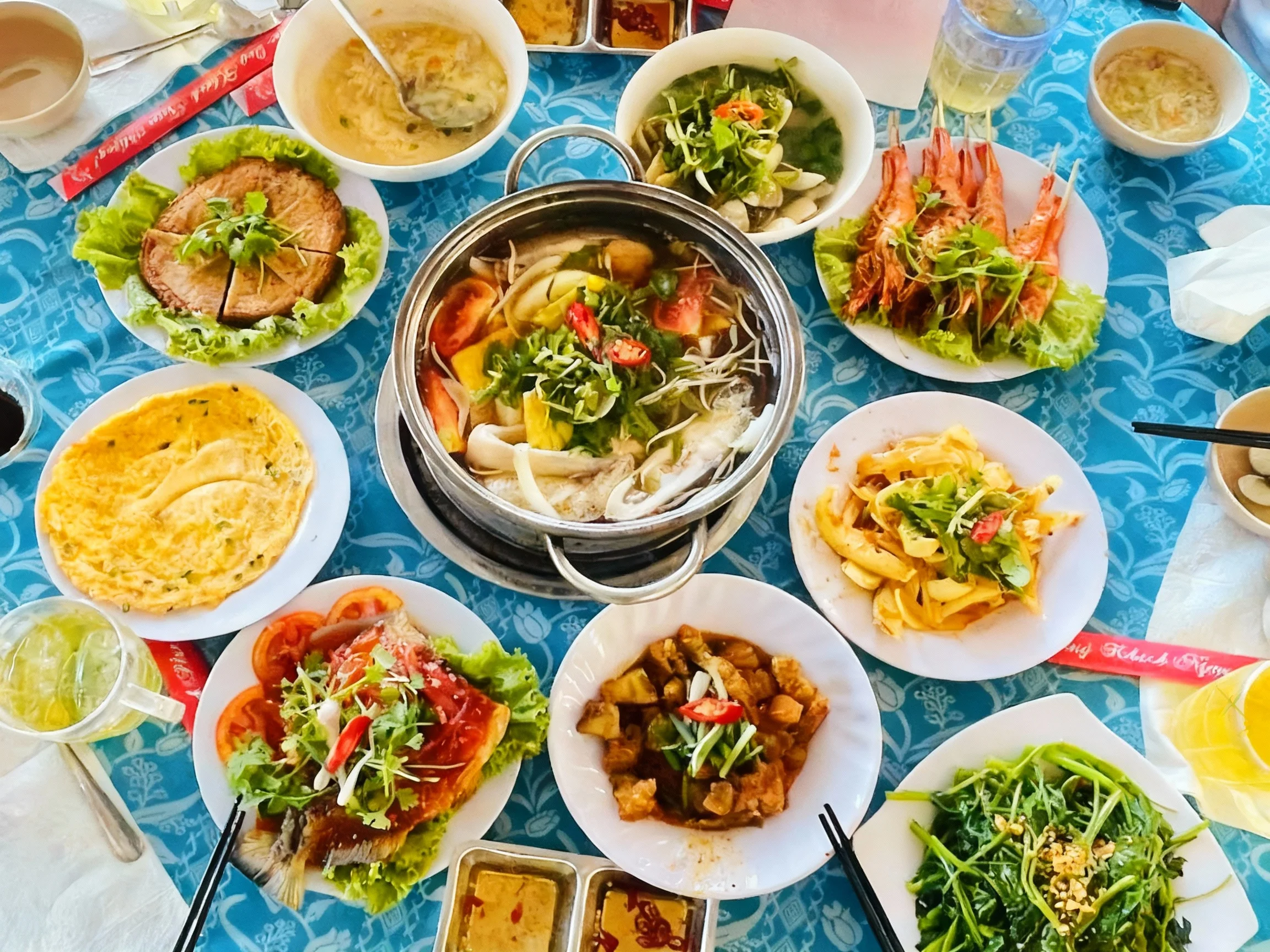 Sau đó là bữa trưa tại nhà hàng với thực đơn 11 món. Quý khách có thể thưởng thức thêm hải sản tươi sống trên những nhà hàng nổi (chi phí tự túc).