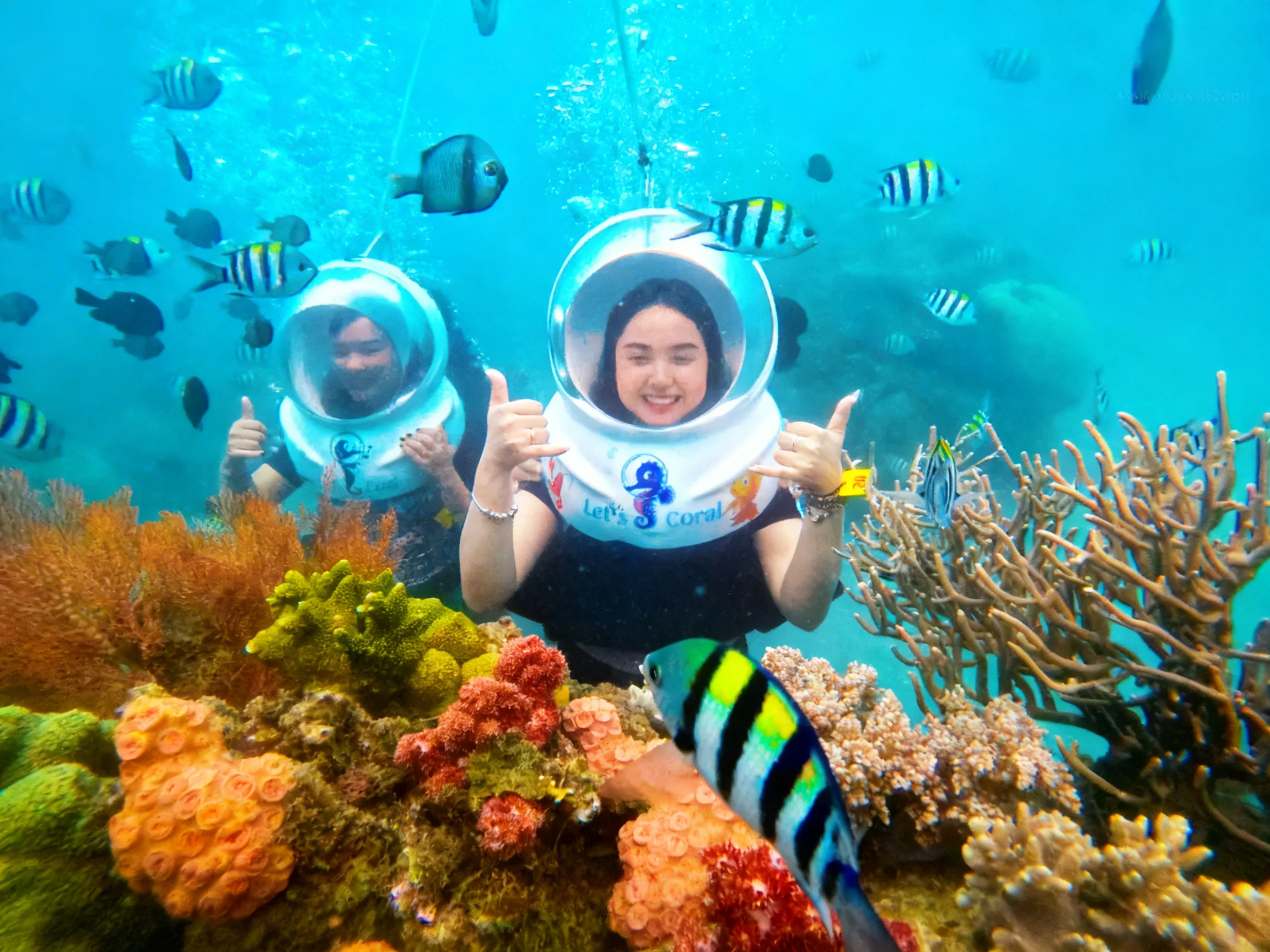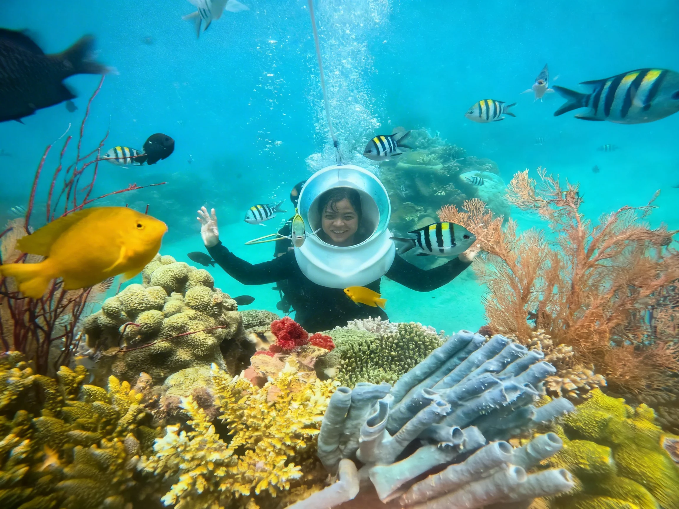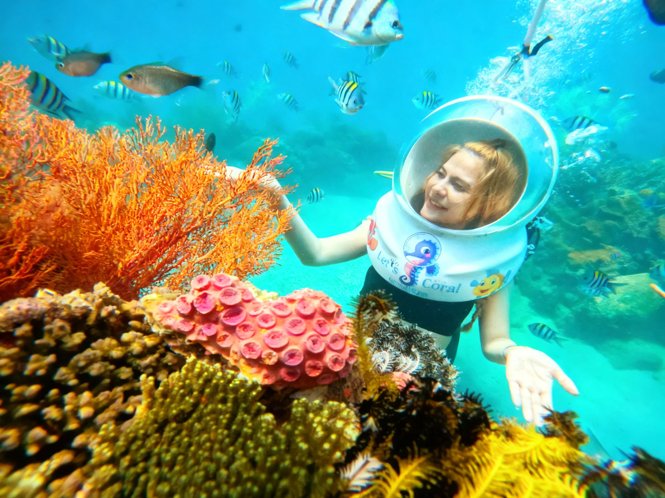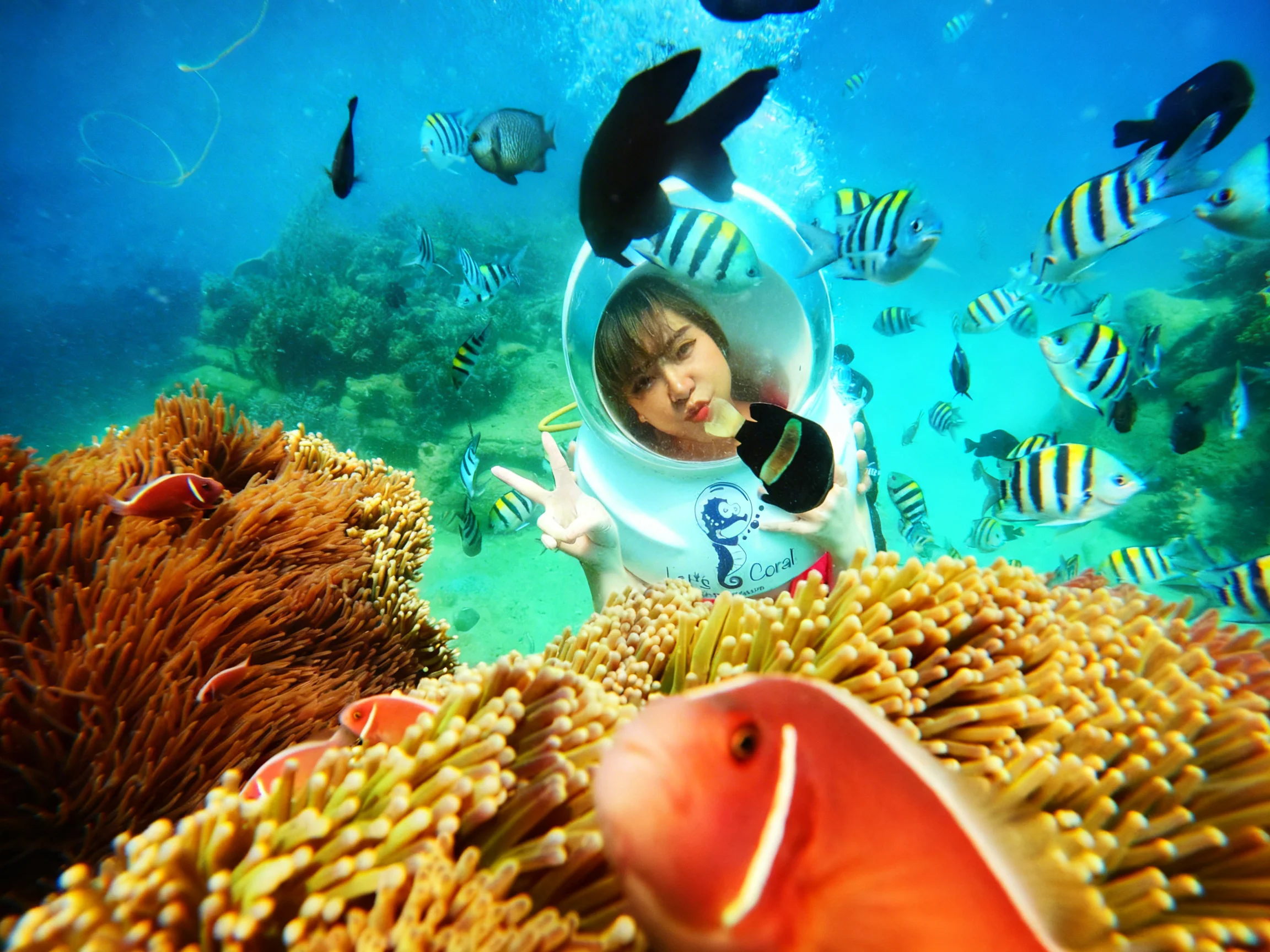Du khách bắt đầu hành trình khám phá đại dương bằng hình thức đi bộ dưới đáy biển. Với sự hỗ trợ của mũ lặn chuyên dụng Sea Walking, bạn có thể: